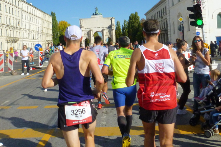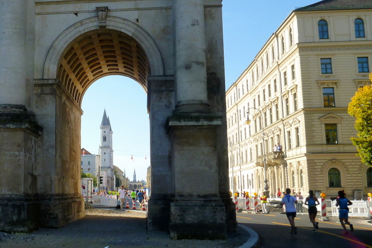 Viele Italiener unterwegs, für sie wurde ein extra Tor mit der Beschriftung „ITALIA“ aufgestellt. Wir untendurch und weiter Richtung Leopoldstraße. Dann biegen wir ein in die 3,6 Kilometer lange Prachtstraße, Richtung Innenstadt. Da sehe ich dann Kilometer fünf und gleich danach das Siegestor, ein klassizistischer Triumphbogen, dessen Bau Ludwig I im Jahr 1840 beauftragt hatte. Das Feld hat sich nun gehörig auseinandergezogen und die Spitze des zweiten Startblockes wird in Kürze von hinten auflaufen.