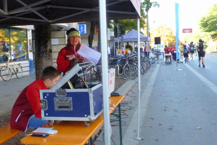 Später höre ich die Münchener Bläserbuben mit ihrer Marschmusik, toll. Schattige Streckenteile wechseln sich mit sonnigen Wiesen ab, es ist erfrischend, so zu rennen, denn die Sonne hat die Luft hier noch nicht so aufgeheizt. Wir unterqueren den Isarring und sehen dann schon erste Halbmarathonläufer an der Strecke stehen. Die starten auf der Halbdistanz um 13.30 Uhr an der Stelle, wo wir den Englischen Garten verlassen. Roland Balzer, Moderator am Start des Halbmarathons, kämpft mit den Tücken der Technik, das Laptop gibt wohl nicht die Infos heraus, die er braucht. „Servus Roland“, rufe ich. Keine Reaktion, er und ein Helfer wursteln am Gerät herum. Ich muss grinsen. Halbzeit, gut 1.50 Stunden bin ich unterwegs.