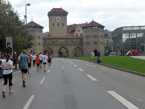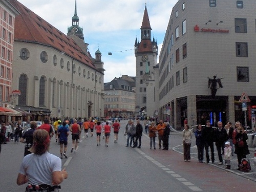 Über den Rosenheimerplatz ging es vorbei am Müller’schen Volksbad. Anschließend passierten wir über die Ludwigbrücke die Isar und waren vor den Toren der Stadt, genauer gesagt vor dem Isartor. Was nun folgte, war der Sightseeing-Part dieses Marathons. Eine Sehenswürdigkeit nach der anderen gab es zu bestaunen und genießen, falls man noch in der Lage dazu war. Nach dem Alten Rathaus folgte ein kurzer Abstecher auf den Marienplatz mit Blick auf das Neue Rathaus mit dem berühmten Glockenspiel. Die Stimmung hier war gigantisch, der Sprecher auf der Empore begrüßte nahezu jeden persönlich und attestierte Hanni und mir einen guten Job.
