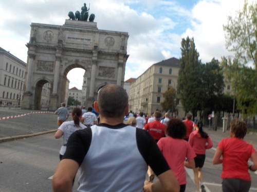 Wir verließen den Olympia-Park und kamen über die Elisabeth-Straße in den Stadtteil Schwabing. Bei Kilometer 2,5 führte uns ein Rechtsknick auf die Leopoldstraße mit einer etwa 3 Kilometer langen Wendepunktstrecke. Jetzt war auch die erste Sehenswürdigkeit des heutigen Tages, das Siegestor im Blickfeld, welches wir kurz darauf erstmals passierten. Unmittelbar hinter dem Wendepunkt bei Kilometer 4 konnten wir zum ersten Mal verpflegen. Wir passierten abermals das Siegestor und liefen nach einem weiteren Rechtsknick bei Kilometer 5,5 in Richtung Englischer Garten.