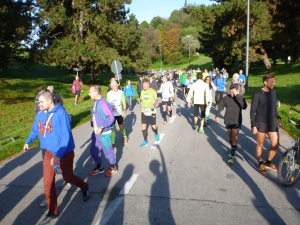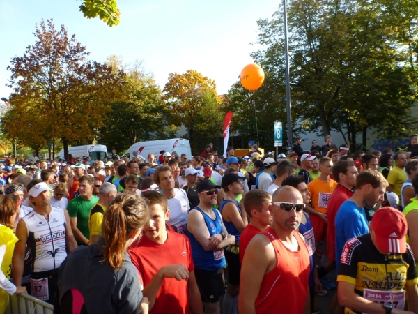 Nach der Kleiderabgabe machen wir uns auf den Weg zum Startpunkt, der sich in knapp zwei Kilometer Entfernung ausgangs des Olympiageländes auf der Ackermannstraße befindet. 15 bis 20 Minuten Spaziergang sollte man veranschlagen. Wer sich einläuft, schafft es schneller. Einlaufen ist beim gemütlichen Marathon ein Schmarrn, mir reicht der Spaziergang dorthin.