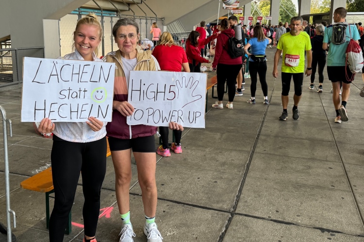 Durch Neubaugebiete nördlich davon laufen wir weiter. Jedes Jahr sieht man hier mehr Zuschauer. Und dann das: Vor einem Einfamilienhaus hat sich ein Grüppchen zum Frühstücken und Marathongucken versammelt. Ich bin gerührt. 20 Jahre lang hatte ich vermutet, dass sich die Bewohner der umliegenden Häuser während des Marathons im Keller verschanzen. Man sieht, die Welt verändert sich und auch der lokale CSU-Kandidat wird langsam vom Kandidaten der Grünen eingeholt. 2021 beim Berlin-Marathon konnten wir ja die langen Schlangen vor den Wahllokalen sehen. Damals war Bundestagswahl, hier steht heute ein neuer Landtag zur Disposition. Ministerpräsident Markus Söder, gleiche AK wie ich, schaut uns oft von den Wahlplakaten zu. Er will sich dafür einsetzen, dass „Bayern stark und stabil bleibt“, damit meint er wohl auch mich.
