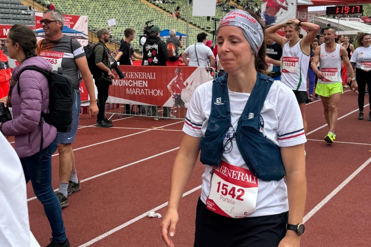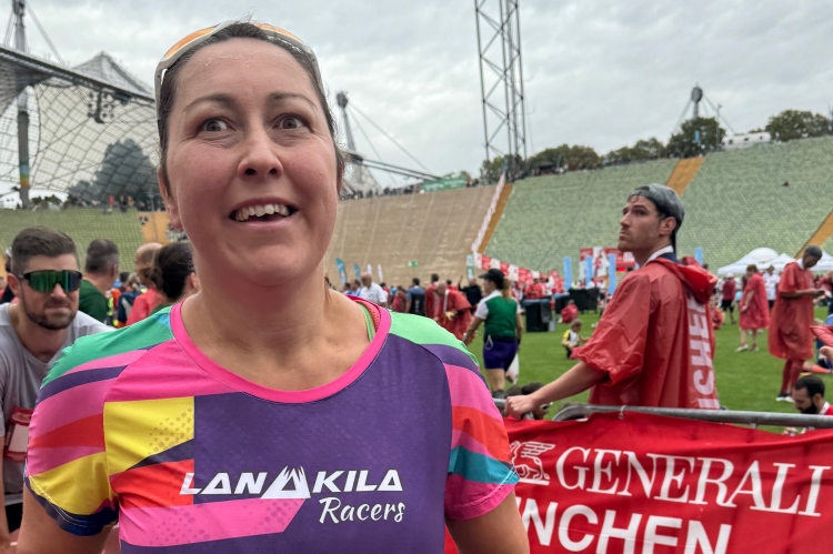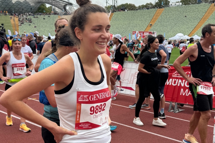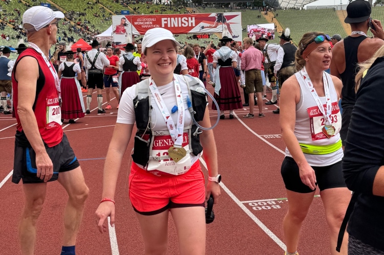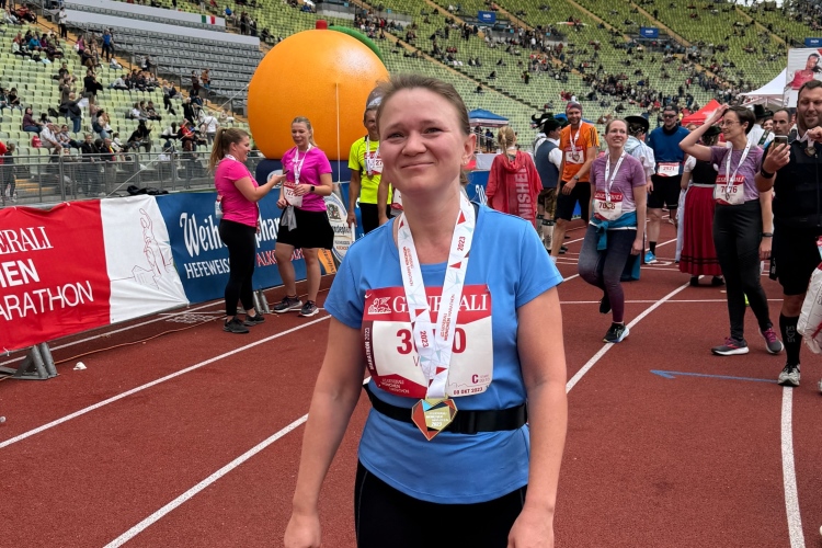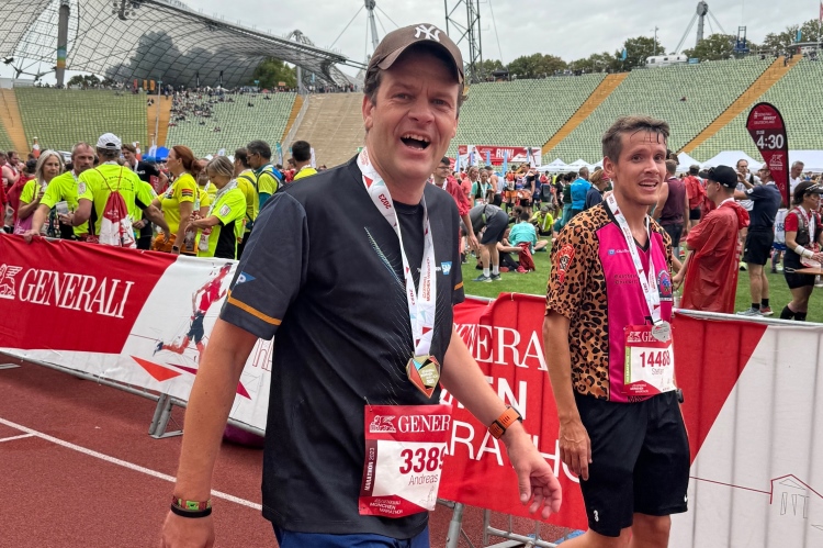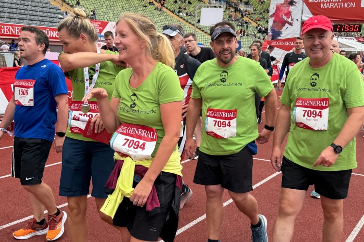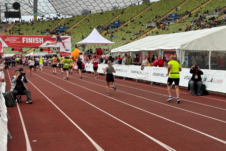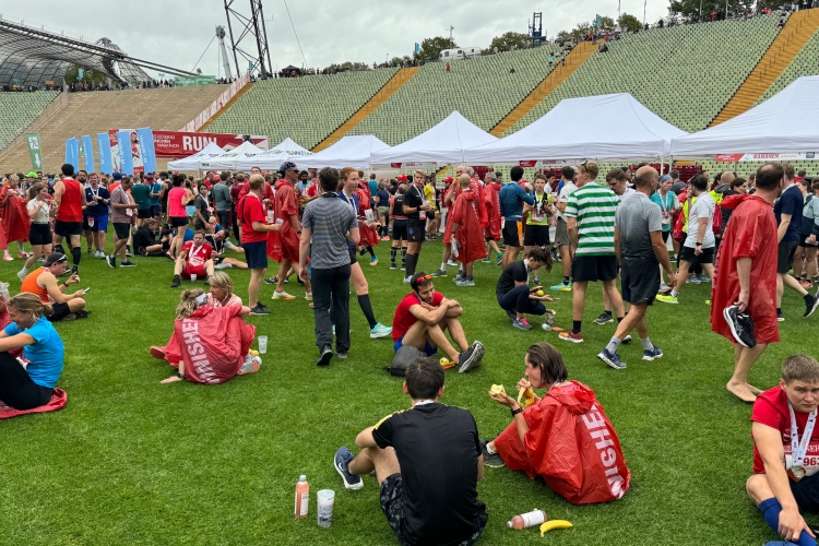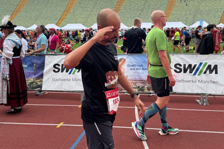 Das Ziel im Olympiastadion ist legendär. Die Verpflegung ist super, dem Andrang nach ist das Bier am beliebtesten. Es gibt auch allerlei andere Getränke sowie Kuchen und Laugenstangen, und man kann bei milden Temperaturen noch schön abhängen und das eine oder andere Schwätzchen halten. Ein Teilnehmer hat zusätzlich zur Münchner Medaille sogar seine Medaille vom diesjährigen Berlin-Marathon dabei.