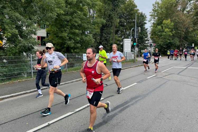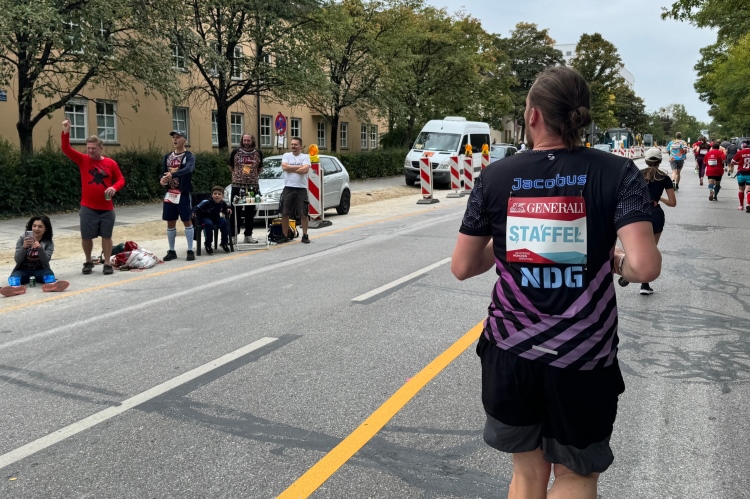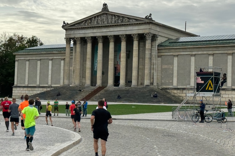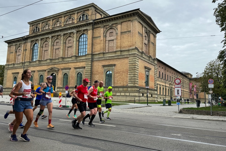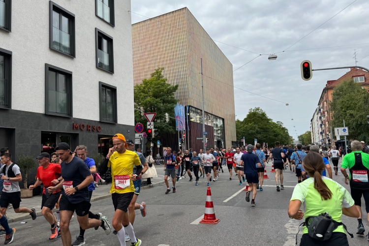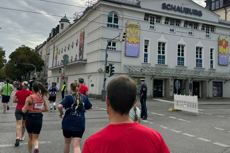 Nächste Musik am Elisabethplatz. Kurz danach biegen wir schon in die Leopoldstraße ein. Vor uns das Siegestor. Dann auf die Ludwigstraße, den Prachtboulevard der Stadt. Oder eher eine breite Autoschneise? Nicht heute. Dann das Hauptgebäude der Ludwig-Maximilians-Universität, Geschwister-Scholl-Platz und die Ludwigskirche als Kirche für die Studierenden. Wir biegen nach rechts, wo uns die schnelleren Läuferinnen und Läufer bereits entgegen kommen.