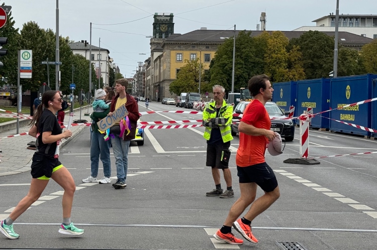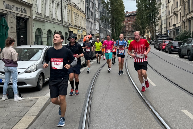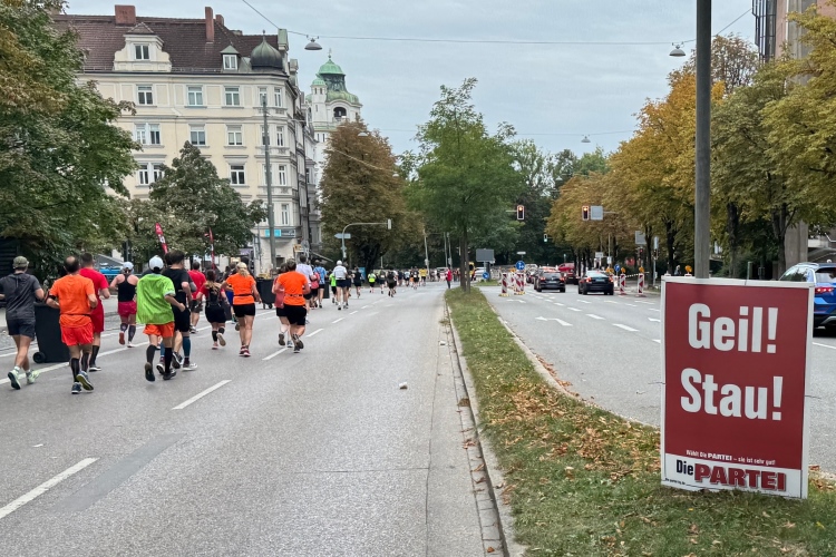 Die Rosenheimer Straße, einmal im Jahr ohne Autoverkehr. Ansonsten kommen die Pendler hier von der Salzburger Autobahn Richtung Stadtzentrum vorbei. Kein Anwohnerfest, so weit ist man hier noch nicht, aber viel Stimmung gibt es schon. Die Wahlwerbung ändert sich. Auf einmal sieht man auch viele Plakate der eher satirischen Formation „Die Partei“. Letztendlich sind wir hier im mittleren Teil der Stadt, wo die Grünen mit fast 45 % das beste Ergebnis erzielen werden. Nur in Oberföhring und Englschalking liefen wir durch CSU-Gebiet. Die Freien Wähler und diese rechte Partei spielen in München keine Rolle. Da zeigen sich durchaus Unterschiede zwischen Stadt und Land. Und heute mussten nur 6.000 Wählerinnen und Wähler die Marathonlaufstrecke kreuzen, um ins Wahllokal zu kommen. Ich werde am späteren Nachmittag noch meine Stimme abgeben und dann auch andere „Nachzügler“ im Laufdress sehen. Das größte Problem wird sein, den dicken Wahlzettel in die fast volle Urne hineinzubekommen.