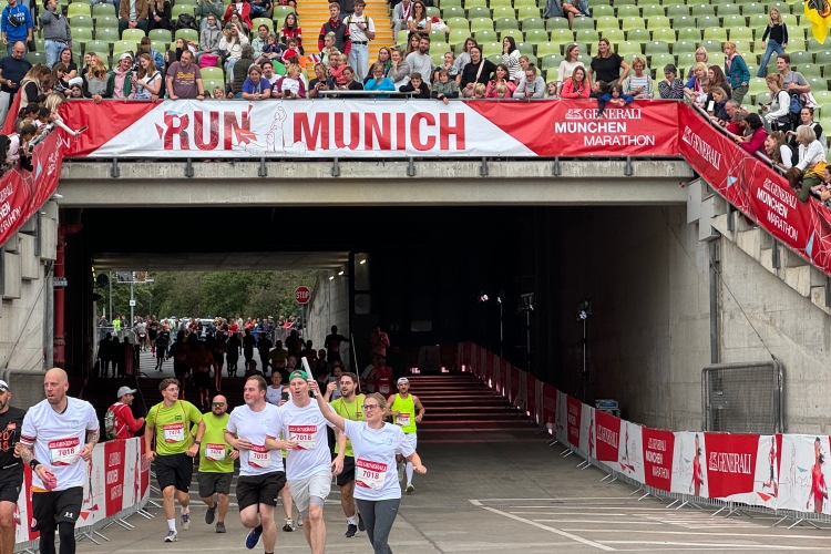 Die letzten 1.700 Meter werden hart. Am Olympiapark vorbei zieht es sich. Der Olympiaturm kommt immer näher und nach dem Schuttberg, der seit 1972 Olympiaberg heißt, sieht man dann auch das Stadion. Das wahrscheinlich schönste Olympiagelände der Welt erwartet uns. Staffeln suchen ihren Schlussläufer. Ich reiße mich zusammen. Der Weg zum Marathontor scheint so weit.