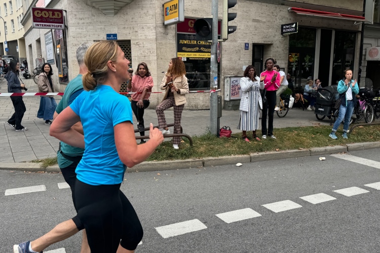 Nach einem guten Kilometer kommen wir im westlichen Schwabing an. Hier bin ich aufgewachsen, kann mich noch an den Bau des Karstadt-Warenhauses erinnern, das inzwischen abgerissen wurde. Gegenüber das Nordbad im klassizistischen Stil. Auffallender ist die Musikgruppe an der Mauer davor: Eine Steelband beim Marathon habe ich schon länger nicht mehr erlebt. Erfreulich ist auch der Zuspruch der Anwohner.