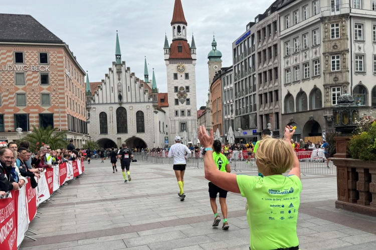 Vor uns jetzt das Isartor, das östliche Stadttor der historischen Altstadt. Links abbiegend erreichen wir den Viktualienmarkt. An der Schrannenhalle, einer alten Markthalle, wartet wieder die vom Trachtenlauf bekannte Blaskapelle Neuried mit ihren Evergreens. Durch das Alte Rathaus kommen wir auf den Marienplatz. Hier stehen die Zuschauer in mehreren Reihen. Den Blick auf die Frauenkirche und das im neugotischen Stil errichtete Neue Rathaus kennt sicher jeder. Eine Sambaband erfreut Zuschauer, Touristen und uns. Um die Mariensäule herum. Hinter dem Dallmayr-Feinkostgeschäft treffen wir auf Florentiner Flair. Am Palazzo Pitti geht der Florenz-Marathon vorbei, hier am Nachbau, dem Königsbau der Residenz, der München-Marathon. Einen Stopp muss man als Münchner kurz einplanen: Die Nasen der vier Löwenfiguren an der Residenz zu reiben bringt angeblich Glück und mir hoffentlich Kraft.