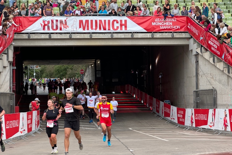 Damit endet meine recht kurze Anreise zum Start des Generali München Marathons. Ich bin extra früh aufgebrochen, da die S-Bahn-Stammstrecke aus dem Jahre 1972 nun öfter einer Reparatur bedarf und man immer wieder Umwege einplanen muss. Dann ging es aber schneller als erwartet. Der Tross der Teilnehmerinnen und Teilnehmer Richtung Olympiastadion ist lang. Umkleiden auf der Tribüne, Taschenabgabe im Tribünenumlauf. Die Luft ist warm und sogar die Sonne zeigt sich.