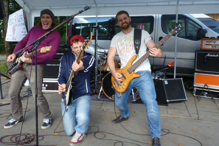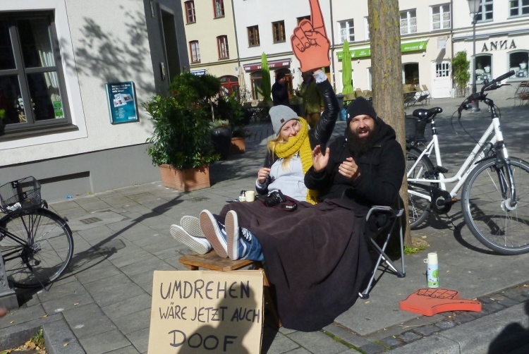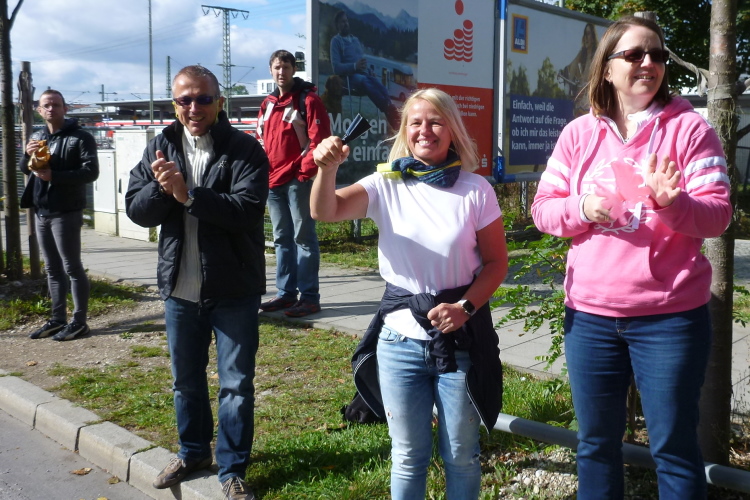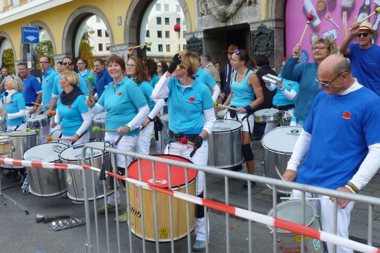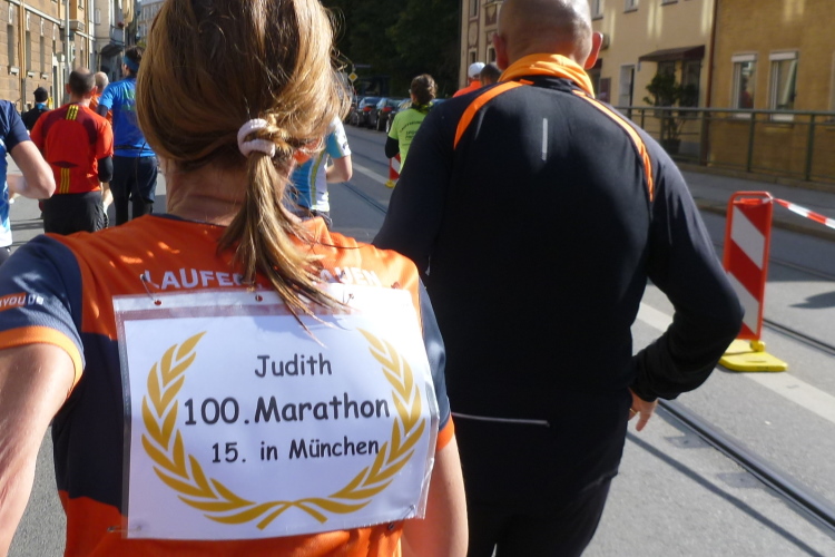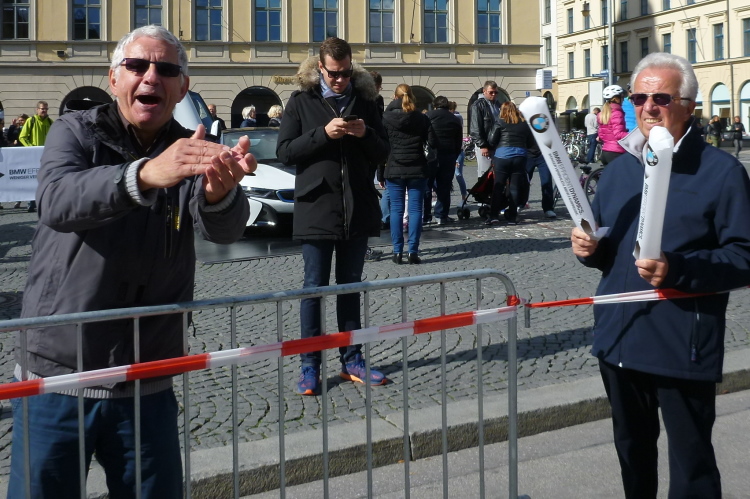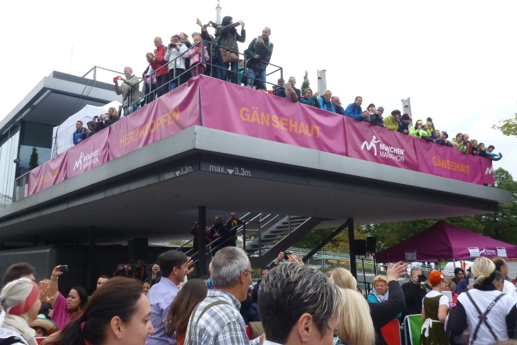 Schon im Englischen Garten bei einem Fotostop hatte ich meinen Namen aus bekanntem Munde rufen hören, in der Stadt auf der historischen Tivolibrücke, die uns über die Isar bringt, ist es dann soweit: Andreas und Judith laufen auf mich auf. Ja, bestätigen sie, ich sei nicht der einzige, der sie für bekloppt erklärt, innerhalb von drei Wochen vier Marathons zu laufen, aber ihre Performance ist wahrlich beeindruckend. Auch heute werden beide unter vier Stunden bleiben, was insbesondere Judith gefallen hat, denn eine flotte Zeit beim 100. Marathon – nochmals herzlichen Glückwunsch dazu! - und das noch in der Heimatstadt, was will frau mehr? Dann geschieht wieder Peinliches: Wie von mir schon in zahlreichen Städten beobachtet, bricht ein Läufer aus der Menge aus und baut sich sich headbangend und pommesgabelzeigend vor einer Heavy Metal Band auf, die ihrerseits Spaß mit diesem Dödel hat. Was tut man nicht alles, um anderen Leuten eine Freude zu bereiten!
