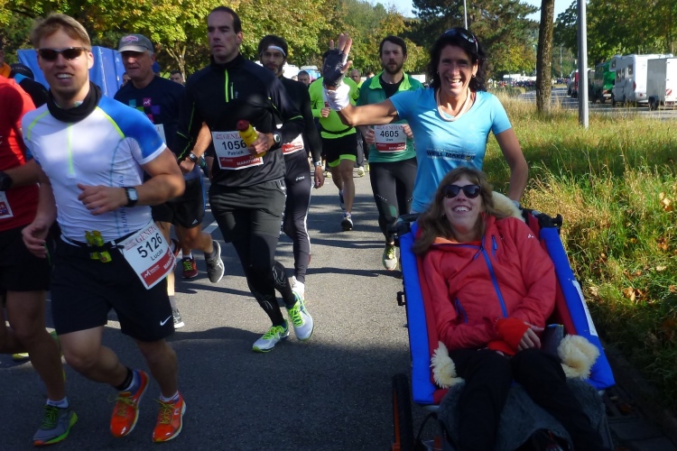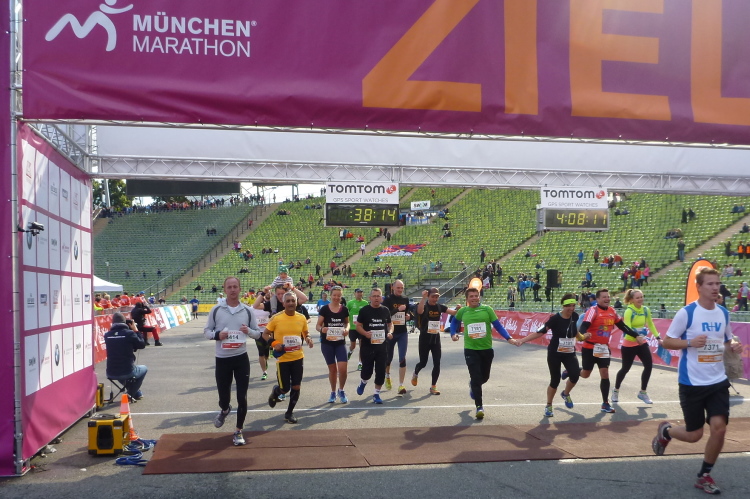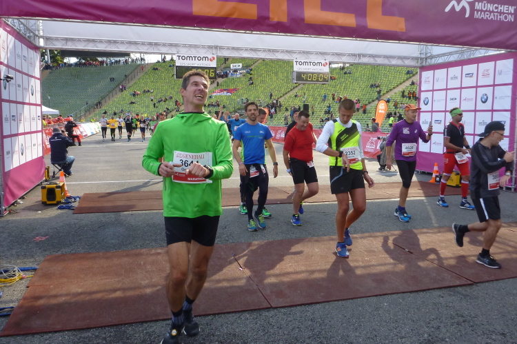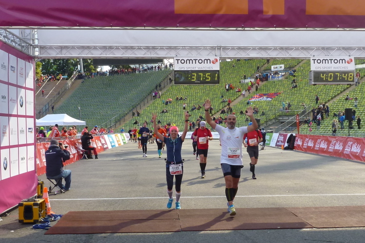 Auftragsgemäß mit einem Siegerlächeln, denn so steht es auf dem Zieltor, habe ich nach 3:54 Stunden, mir ist sogar ein negativer Split gelungen, sehr zufrieden fertig (Giovanni Trappatoni läßt grüßen). Wenig später, netto sogar ein paar Sekunden schneller als ich, überqueren Judith und Andreas Hand in Hand strahlend die Ziellinie. Herzlich willkommen im Club, liebe Judith! Eine attraktive Rückseite, mit der ich mich über viele km duelliert habe, busselt mich (erfreulicherweise allerdings von vorne) zur Belohnung für meine herzlichen Glückwünsche kurz entschlossen ab. Wer behauptet da, Laufen sei keine gewinnbringende Beschäftigung? Die tolle herzförmige Medaille steigert meine gute Laune weiter. Ein gemeinsames M4Y-Familienfoto und mein zufrieden eingelaufener Freund Klaus beenden diese schöne Veranstaltung.