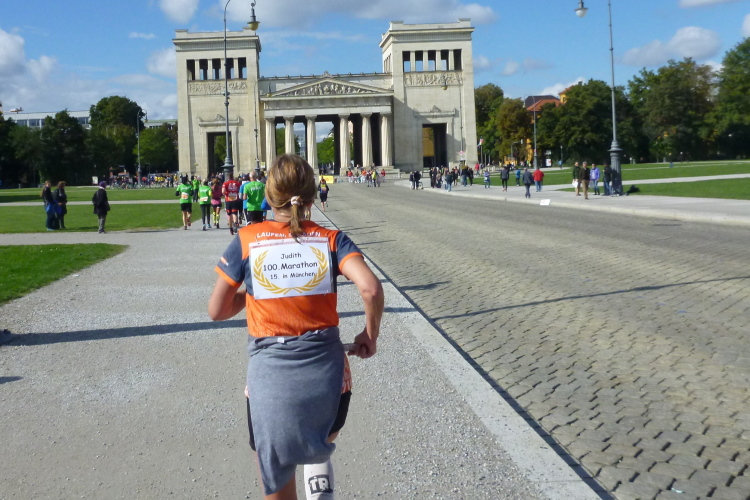 Links abgebogen, laufen wir im Karree etwa drei km in und um die Maxvorstadt, eine gute Gelegenheit zum Betrachten erst der schnelleren, dann auf dem Rückweg der langsameren Konkurrenz. Bei km 36 sind wir wieder zurück, wo wir abgebogen waren und steuern wieder Schwabing, die Ludwig-Maximilian-Universität passierend, an. Jetzt endlich kommen wir zum Siegestor, das wir von der Ferne aus am Anfang bereits hatten ausmachen können. Etwas krüppelig und unvollständig sieht es im oberen Bereich aus, was sich beim Näherkommen schnell als Folge der Kriegsschäden und eines stark vereinfachten Wiederaufbaus erklärt: „Dem Sieg geweiht, vom Krieg zerstört, zum Frieden mahnend“ steht als Erklärung über den Säulen der Rückseite.