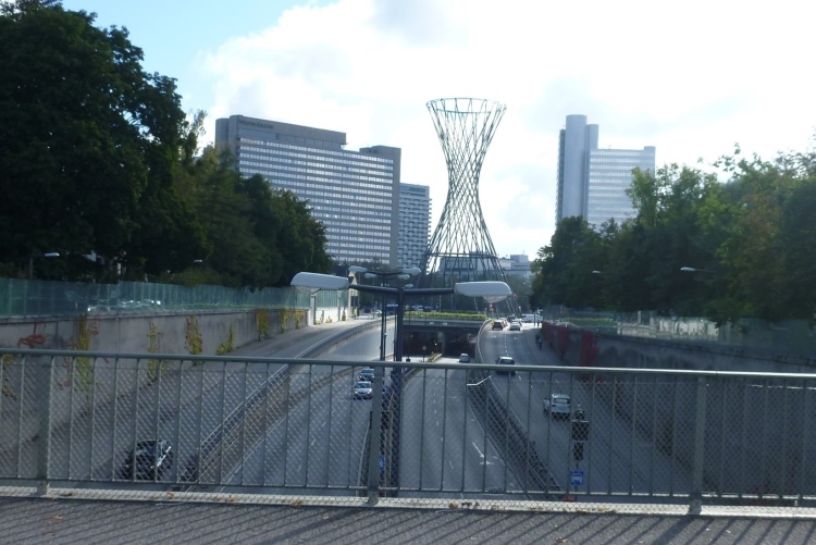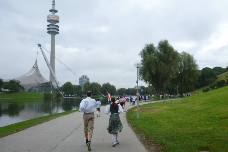 Die jetzt folgenden fünf km entsprechen bis auf den Zieleinlauf den ersten fünf. Den riesigen weißen „Walking Man“, der zwischen Bäumen hervorlugt, hatte ich auf dem Hinweg gar nicht wahrgenommen. „Mannsbilder“, „Provokation – Die Entdeckung der Langsamkeit“ - diese Werbeschilder ermahnen mich, nicht zu sehr in den Schlappschritt zu verfallen, obwohl schon seit geraumer Zeit klar ist, daß die vier Stunden heute kein Problem darstellen werden. Schon erscheint der Olympiaturm am Horizont und kündet vom nahen Ende dieses Marathonlaufs. Mit dem 40. km ist der Eingang zum Olympiagelände erreicht, die gewaltigen Metallstreben, die div. Gebäudedächer, vor allem aber das des Stadions halten, sind einfach zeitlos schön. Erstaunlich, daß die Siebziger Jahre, die in meinen Augen fast nur wenig attraktives Schnörkelloses hervorbrachten, etwas so Schönes hinterlassen haben.