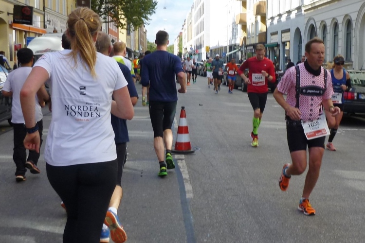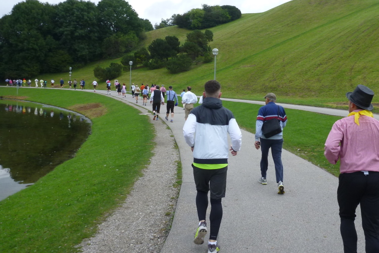 Als ob es im gleich folgenden Englischen Garten nicht genug Bäume gäbe, grüßt linkerhand in einem Hof eine große, silbermetallene Baumskulptur. Eine schöne und sicher exorbitant teure Gegend durchlaufen wir, bevor wir erstmals an einer Wechselstelle der Staffeln vorbeikommen, die zwanzig Minuten nach uns gestartet sind. An diesen und wenigen anderen Kulminationspunkten ist richtig Stimmung, was man leider nicht von überall behaupten kann. Ja, wenn man ehrlich ist, hält sich das Zuschauerinteresse für eine Stadt dieser Bedeutung und Größe doch leider in engen Grenzen. Das Laufen scheint für die Münchner nicht ganz so im Mittelpunkt zu stehen wie andere Sportarten.
