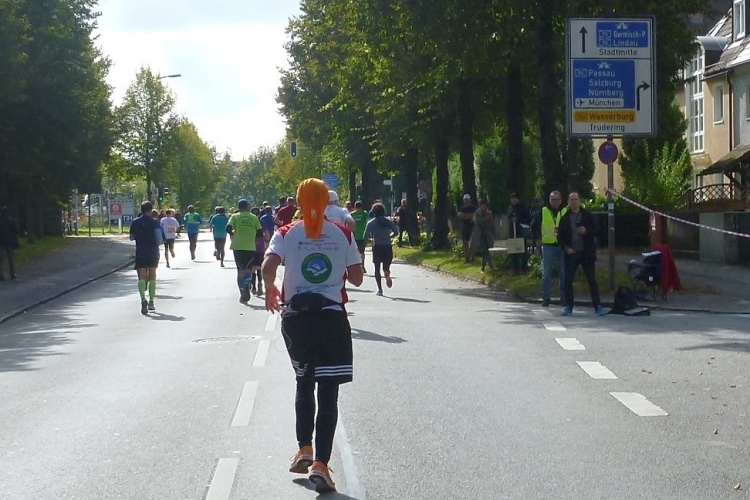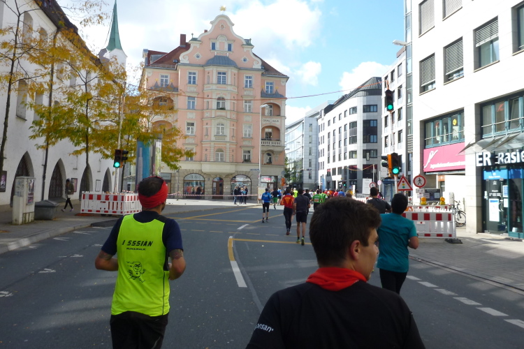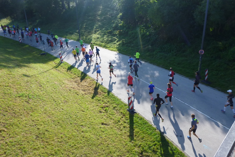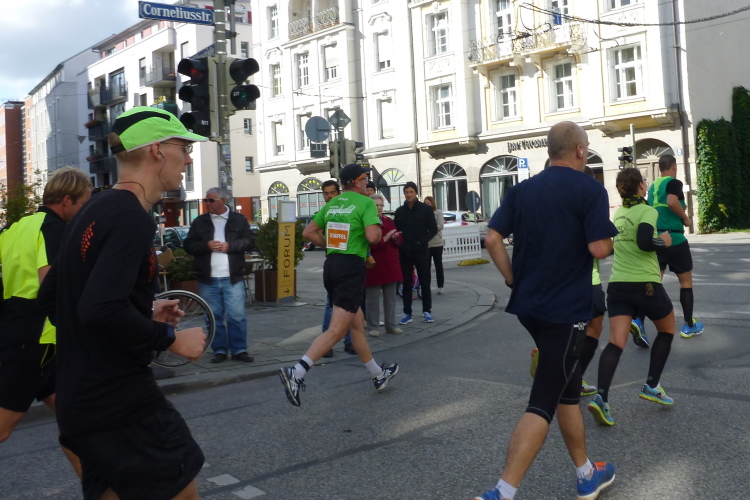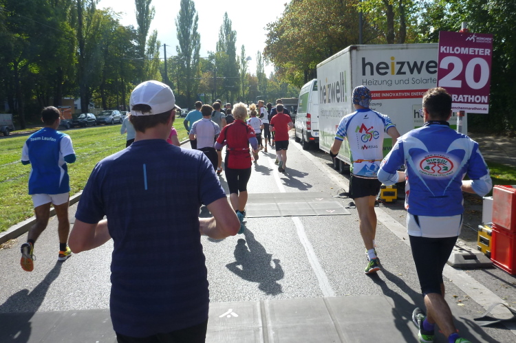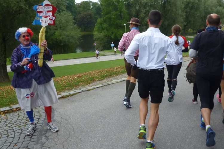 Ziemlich frisch ist es so unter den Bäumen. Hatte ich beim Start noch Bedenken, mit einem dicken langärmeligen Unterhemd und einem ebensolchen Shirt zu warm angezogen zu sein, bin ich jetzt froh, beides anzuhaben. Die Nichtläufer, an denen wir vorbeikommen, sind kleidungsmäßig mit dicken Jacken schon ganz auf Winter geeicht. Vertrautes unterwegs: Sowohl Deutschlands Lauffotograf Nr. 1, Norbert Wilhelmi, als auch Marathonoriginal Michael Descombes geben sich ein Stelldichein und bieten willkommene Fotomotive. Leider kommen wir nicht am Chinesischen Turm vorbei, den ich gerne mal mit eigenen Augen gesehen hätte. Du hast doch in München studiert, wird manch Kundiger jetzt einwenden. Au weia, was habe ich damals alles versäumt! Unter der Woche gelernt und zu früh verheiratet jedes Wochenende über 400 km nach Hause gedonnert, ist mir so manches Glanzlicht in diesem Lebensabschnitt verborgen geblieben.