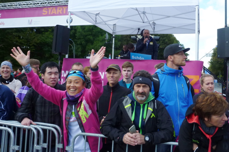 Weniger als 24 Stunden später sind wir wieder auf dem Olympiagelände zurück. Welch ein Unterschied! War es gestern eine doch eher überschaubar große Menschenmenge, ist es heute richtig voll. Der Morgennebel von Untermenzing (Stadtteil, in dem wir derzeit zuhause sind) ist bereits eitlem Sonnenschein gewichen, allerdings ist es noch sehr frisch. Gut, daß wir in die große, lichtdurchflutete Olympiahalle flüchten können, in der die Marathonmesse noch in vollem Gange ist und der Laufclub 21 von Anita Kienle sowie der Pumuckl & Co. für Selfies und M4Y posen. Seinen Gang nimmt auch alles sonst so Unvermeidliche, sodaß Klaus und ich bestens motiviert und unbelastet im Startblock stehen. Versehentlich sind wir in den zweiten geraten (bis 3:45 Zielzeit), beschließen aber, dazubleiben.