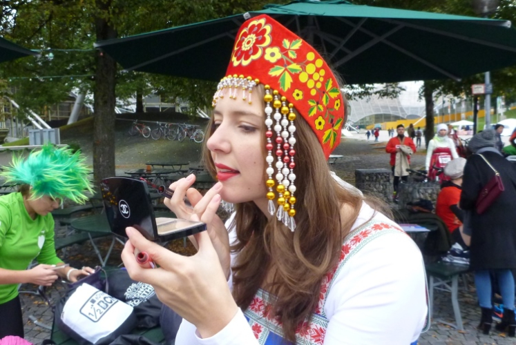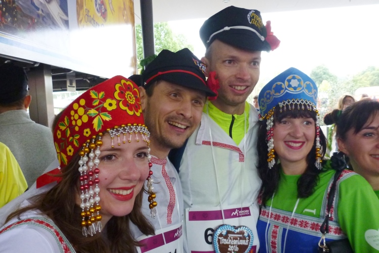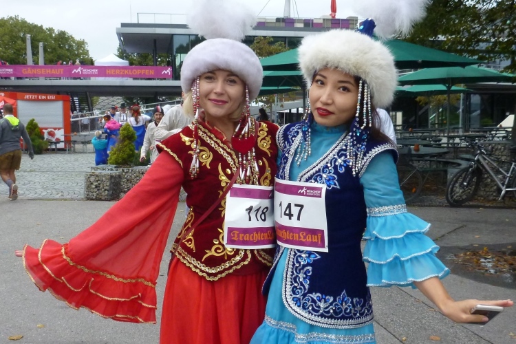 Der Samstag steht ganz im Zeichen des um 10:30 Uhr gestarteten Trachtenlaufs. Als Freundschaftslauf ohne Zeitnahme über 3 km kreuz und quer übers Olympiagelände durchgeführt, ist er ein echter Knüller, den man sich, zumindest als temporär „Zug'roaster“, keinesfalls entgehen lassen sollte. An die tausend mehr oder weniger landestypisch Kostümierte geben ein gleichermaßen buntes wie fröhliches Bild ab. Was ich schon häufiger über das Völkerverbindende unseres Lieblingssports geschrieben habe, trifft auch hier zu: Russen, Kasachen, Kirgisen, Ungarn, Spanier, Chinesen, Japaner, Franzosen, Italiener, Ösis und viele Nationen mehr geben sich ein friedliches und ausgelassenes Stelldichein.
