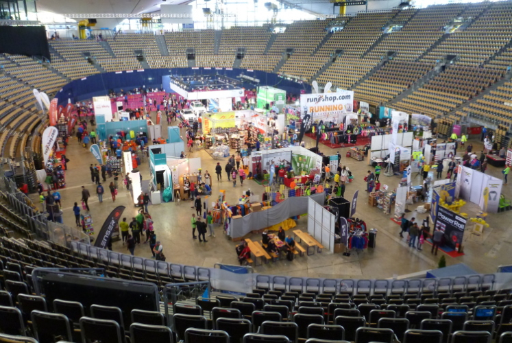 Am Freitagmittag angereist, besuchen Barbara, Elke, Klaus und ich schon bald die Marathonmesse, die in der Großen Olympiahalle auf dem Olympiagelände residiert. Wie übrigens alle Aktivitäten in einem Radius von wenigen hundert Metern stattfinden. Die Örtlichkeiten von 1972 sind unverändert funktional und für meinen Geschmack außerordentlich attraktiv, was man beileibe nicht von jeder modernen Architektur behaupten kann. Innen trifft uns der Schlag: Eine Menschenschlange zieht sich einmal quer durch die Halle, wir rechnen mit dem Schlimmsten, werden aber angenehm enttäuscht: Gleich fünf Schalter stehen den angehenden München-Marathonern 2016 zur Verfügung, in kaum 15 Minuten haben wir die Halle mit allem Erforderlichen wieder verlassen.
