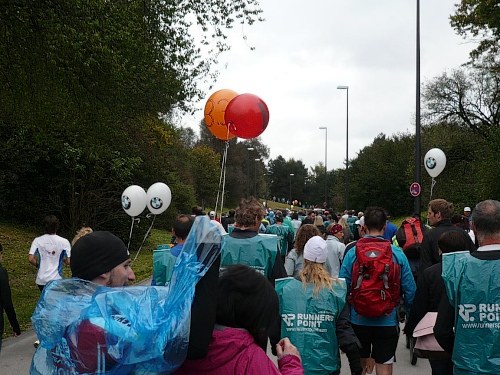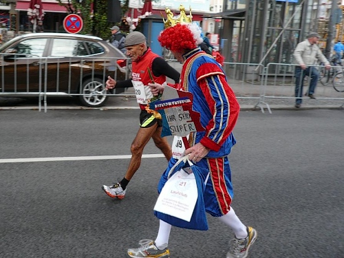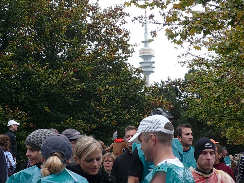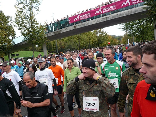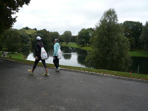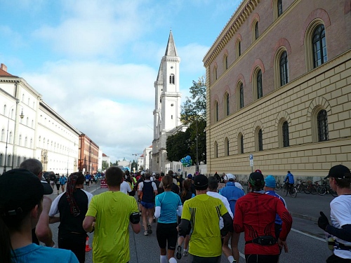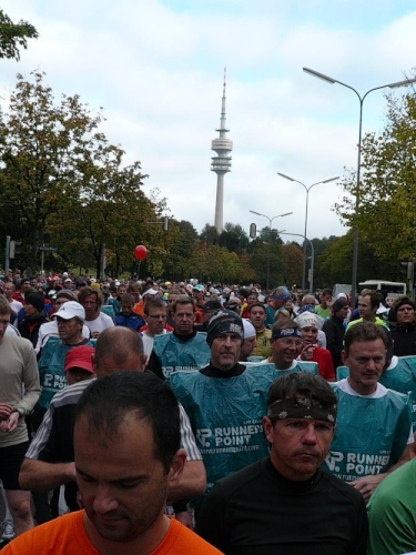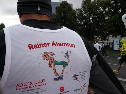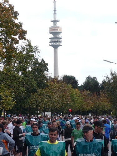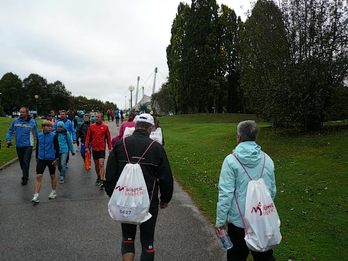 Sonntag früh heißt es zeitig aufstehen, denn Anfahrt, Kleiderabgabe und dann der Spaziergang zum Start werden schon etwas Zeit benötigen. Einige von meinen Vereinskollegen haben auch beim ganzen Marathon oder beim Halben gemeldet. Petra, die ich zur Bayerischen Meisterschaft geschleift habe und dafür meine Begleitung bei einem Marathon versprechen musste, will sich das schon eine Woche später erneut antun. Wenn der Bayer eine Sache gemütlich erledigen will, gebraucht er gern das Wort griabig. Und so soll bei uns beiden der Lauf verlaufen (wieder ein Wortspiel). Rund vier Stunden sollen es sein. Zur Anfahrt hat sich noch Markus zugesellt, den ich letztes Jahr begleitet habe. Heute will er seine 3.34 Stunden deutlich verbessern.