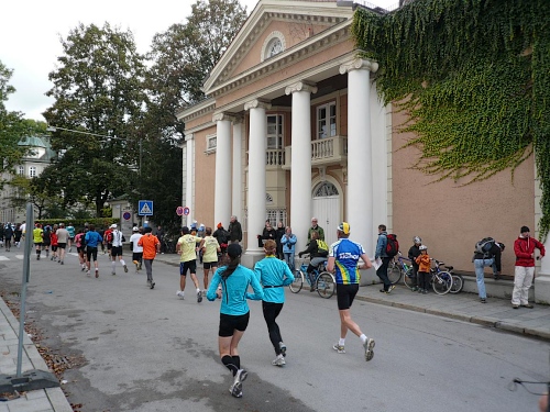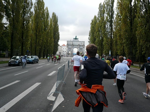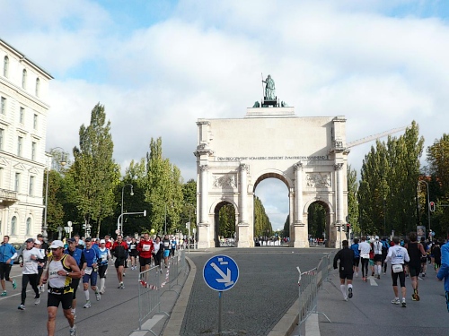 Direkt am Siegestor hat sich die Sambagruppe Go Brazil postiert. Mit einem schmissigen Sambarhythmus läuft es sich gleich leichter. Top, dass wir nach der Wende an den Trommlern noch mal vorbeidürfen. 1840 erteilte Ludwig I den Auftrag zu diesem Triumphbogen, der dem Konstantinsbogen in Rom ähnelt. Von oben herab grüßt die Quadriga (Bavaria mit vier Löwen). Nach den Zerstörungen im Zweiten Weltkrieg wurde das Bauwerk vereinfacht wiederhergestellt. Mit der Inschrift „Dem Sieg geweiht, vom Krieg zerstört, zum Frieden mahnend“ ist es von einem Kriegsdenkmal zu einem Mahnmal zum Frieden geworden.