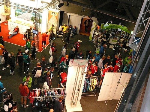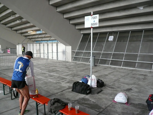 Gegen acht Uhr begeben wir uns zur EventArena, wo der Sportler in der Laufmesse noch einkaufen kann. Im oberen Stock werden die Startunterlagen ausgegeben. Am Nachmeldetisch ist schon Betrieb. Startnummern und Kleidersäcke werden ausgeben. Wir machen uns hier gleich fertig, denn es ist warm und Platz ist genug.