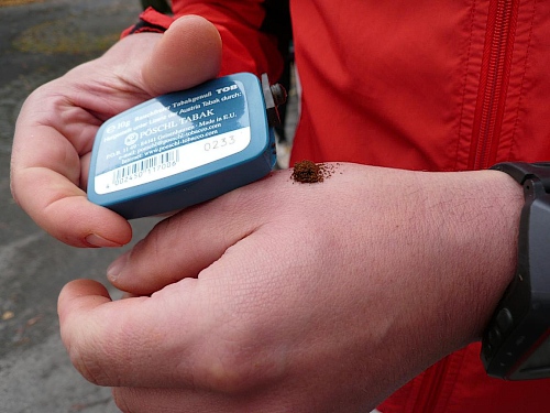 Wir verlassen die EventArena und gehen zur Kleiderabgabe, die unter dem Olympiadach eingerichtet ist. Ausgegebene Plastikumhänge sind bei den kühlen Temperaturen nicht verkehrt. An der Kleiderabgabe treffen wir Stefan, der uns für das feine Näschen noch einen Schmeizler anbietet. Was das ist? Na, a Pris oder a Schnupftabak. Selber zieht er sich zwei Ladungen hinein, eine ins linke, die andere ins rechte Nasenloch. Pfuidaifi!