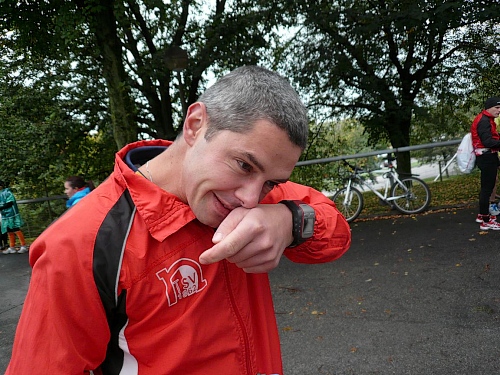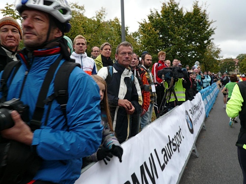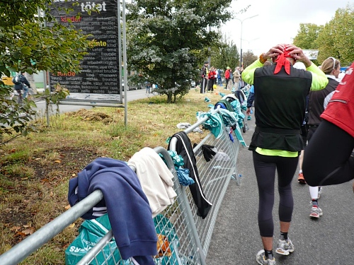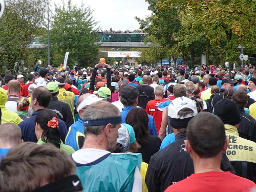 Markus trödelt umher und wird erst hektisch, als ich den Aufbruch zur Kleiderabgabe kurz nach 09.00 Uhr ankündige. „Wo ist meine Startnummer?“ ist als erstes von ihm zu hören. Wahrscheinlich hat er sie irgendwo hingelegt. Eine Nachfrage beim Trouble Desk bringt keinen Erfolg. Als ich mich da einschalte, bekommt Markus eine andere Startnummer. So erspart er sich das Einlaufen und hat einen Endorphinausstoß, bevor das Rennen gestartet ist.