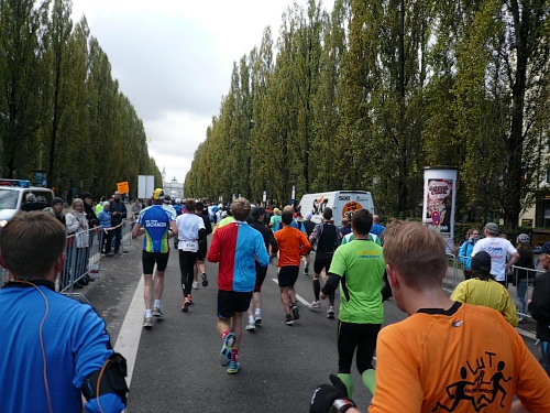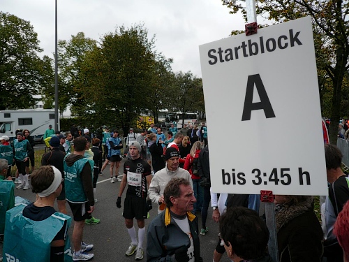 Nach der Kleiderabgabe machen wir uns auf den Weg zum Startpunkt, der nicht mehr auf dem schmalen Spiridon-Louis-Ring, sondern auf der breiten Achermannstraße eingerichtet ist. Vom Stadion sind das fast zwei Kilometer zu Fuß. Zwei Startblöcke sind da eingerichtet: Der Block A für Läufer bis 3.45 Stunden und B für den Rest. Wir entscheiden, in den vorderen Block zu gehen und da wollen wir uns in der hinteren Hälfte einreihen.