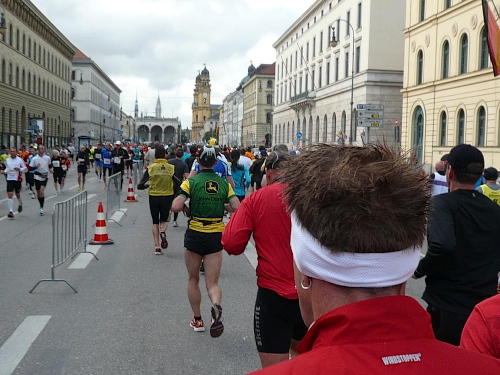 Es dauert keine 15 Minuten, da biegen wir auf die Ludwigstraße ein. Klaus Ruscher moderiert bei fetziger Musik auf Schwabings Hammer- und Partymeile. Viele Zuschauer stehen noch nicht an den Straßenrändern, aber gegen Mittag, wenn die ersten Läufer zurückkommen, werden es hoffentlich mehr sein. Ja, als Zuschauer musst heute schon kälteresistent sein. Einzelne haben schon dicke Stiefel und Jacken aus dem Winterdepot geholt.