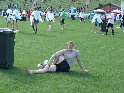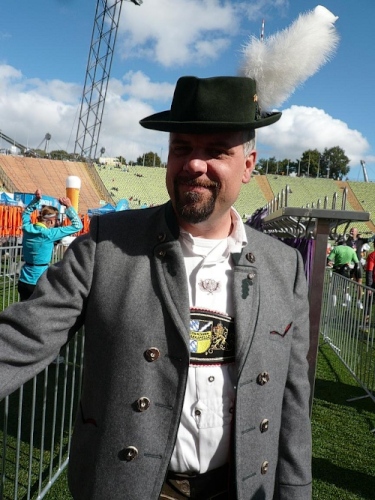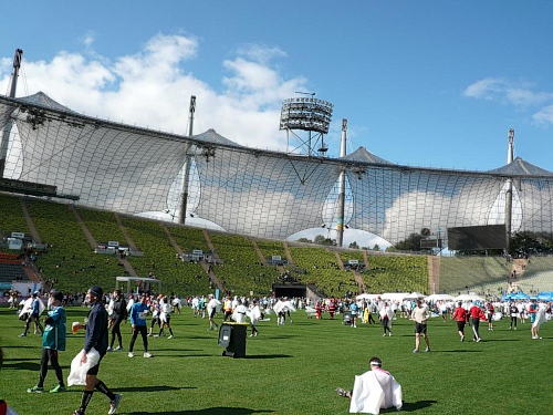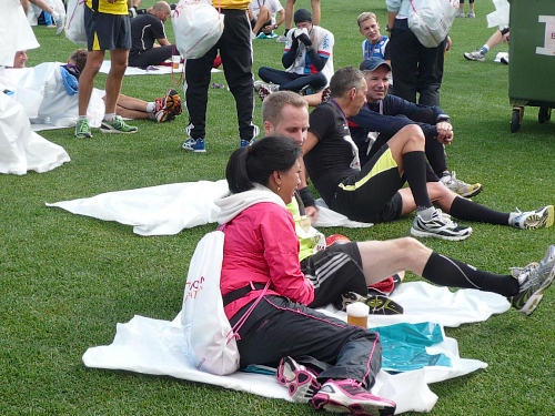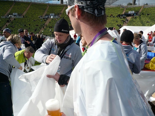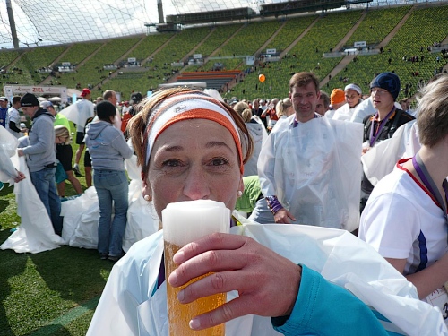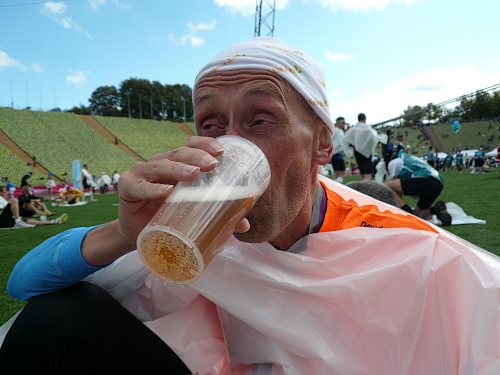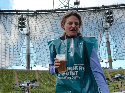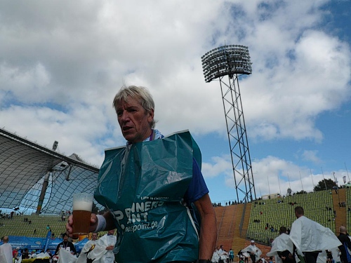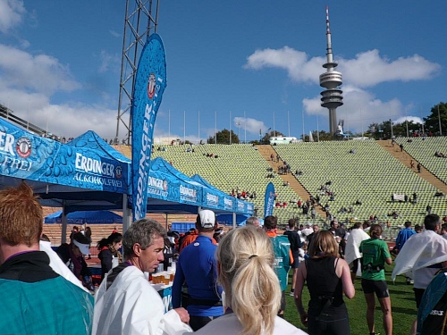 Der olympische Rasen gleicht einem Heerlager. Brezen und Erdinger Bier, dafür laufen wir 42 Kilometer gern. S’Erdinger is hoit koa Blembe. Das Marathonvolk ist halt eigenartig. Habt’s alles verstanden, host mi? Heit samma Marathon in Minga!