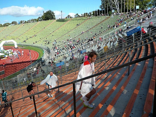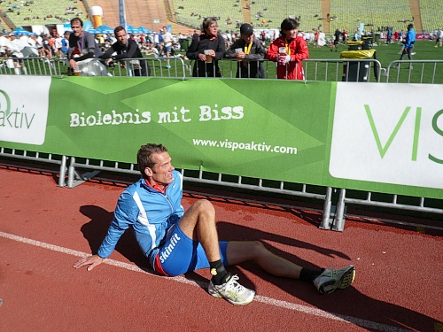 Am Ende der Finsternis grelles Sonnenlicht, Rockmusik, Applaus, affengeile Stimmung. Wir sind im Olympiastadion. Und dann der Zieldurchlauf. Gänsehautfeeling pur. Hast du gut gemacht, Petra. Sie fällt mir um den Hals. „Es ging heute deutlich leichter als in Lindau. Die anderen Schuhe, die kühle Witterung und vor allem der defensive Beginn, das war entscheidend“, so ihre ersten Worte, überhaupt nicht in Atemnot.