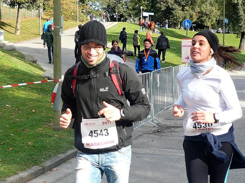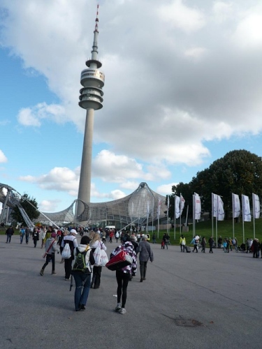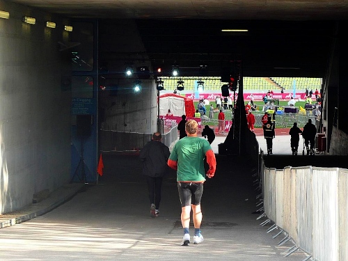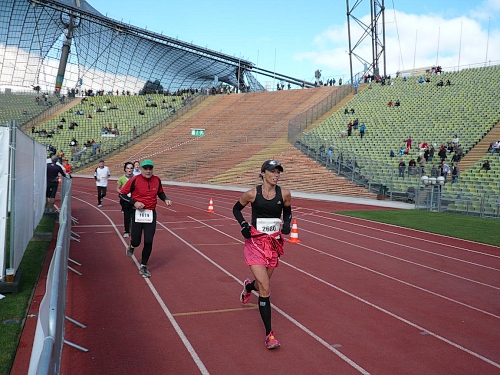 Olympiaturm und Olympiasee sind zu sehen. Für ein paar Aufnahmen habe ich noch Luft. Aber stehen bleiben brauche ich nicht, denn Petra zieht an. „Da vorn geht es in den Discotunnel“ als letzte Motivation. Musik, Lichter und die Ansage: „Nur mehr 350 Meter für Sie.“