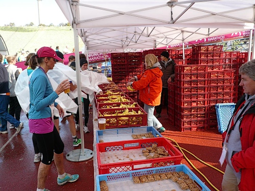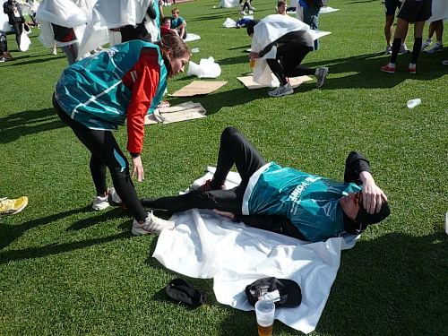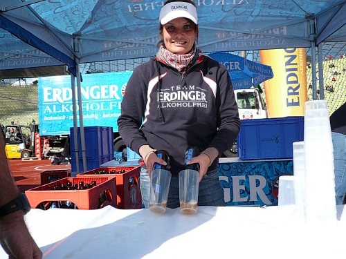 Stefan kommt dazu, hat den Weißbierbecher schon halb leer geschlürft, und ist trotz verletzungsbedingter sub-optimaler Vorbereitung noch eine 3.22 gerannt. Für Petra und mich reichte es sekundengleich zu einer 3.34.