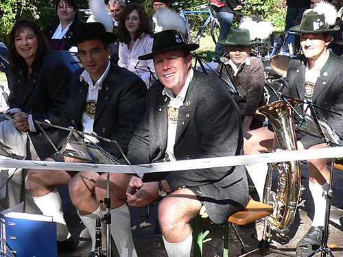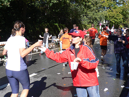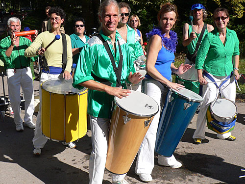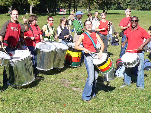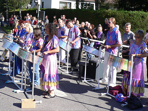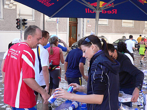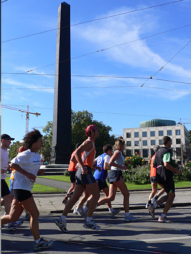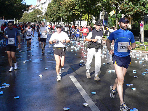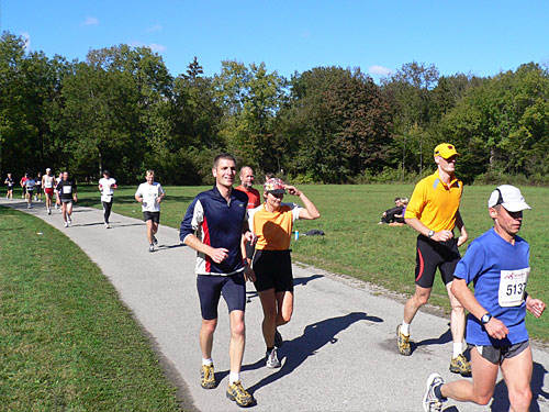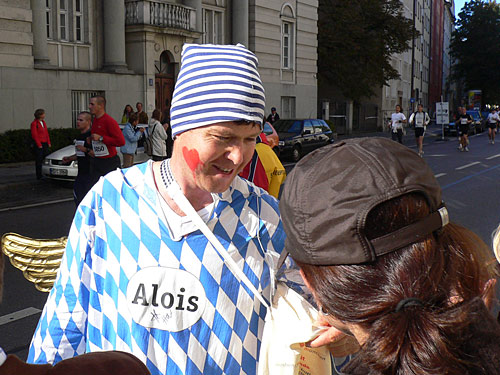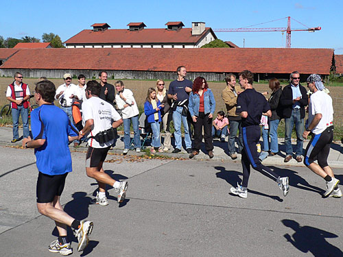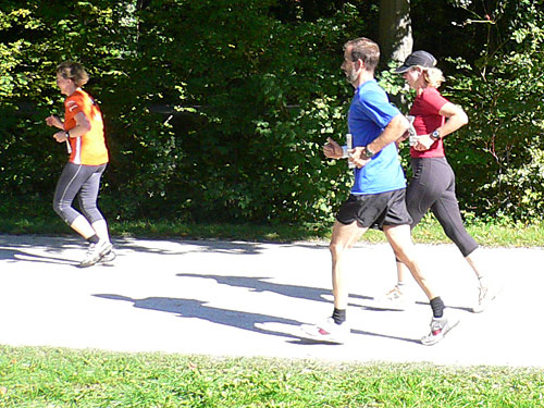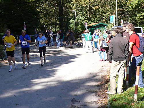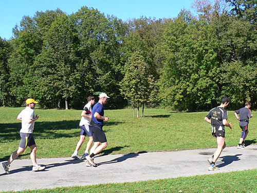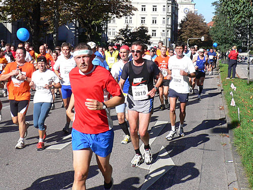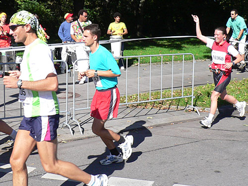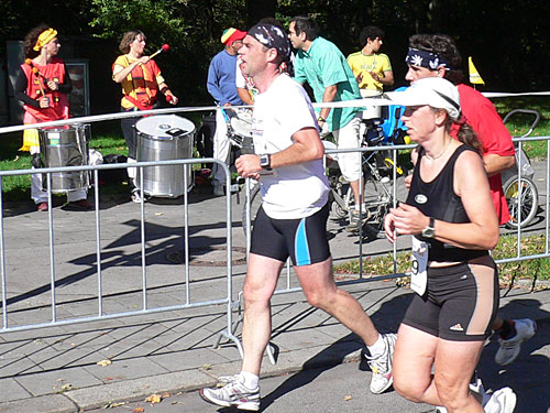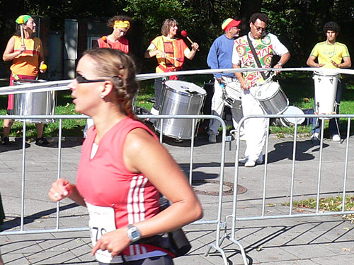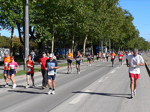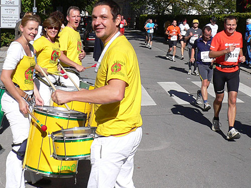 Unsere Strecke hat hier einen ihrer wenigen Anstiege. Links geht es jetzt zum Ostbahnhof (km 16). Die Gegend sieht gar nicht so schlimm aus, wie der Name befürchten lässt. An der S-Bahnstation haben sich sogar etliche Fans postiert, um uns anzufeuern. In der Neumarkter Straße überrascht uns eine Steelband mit gekonnt vorgetragenen Schlagern aus den 60ern.