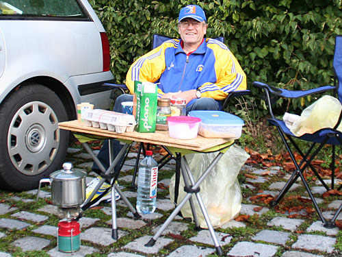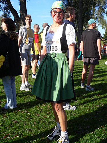 Jetzt wird aber die Deutsche Nationalhymne gespielt. Obwohl wir das alle den Sommer über kräftig geübt haben, singt kaum einer mit. Um 9.55 Uhr gehen dann die Teilnehmerinnen und Teilnehmer der Deutschen Meisterschaft auf die Strecke, fünf Minuten später das übrige Feld.