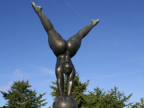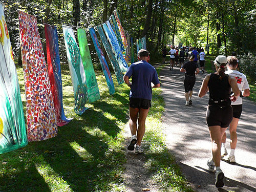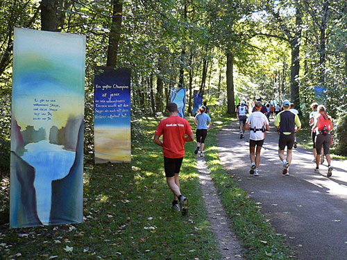 Die Seefelder Blaskapelle bei km 32 macht leider gerade eine Pause. „Gleich geht’s weiter“, verspricht der Dirigent nach lautstarken Beschwerden. Darauf will ich nicht warten. Entlang des Schwabinger Baches geht es weiter zur Open-Air-Ausstellung von Ingo Bogatu, der seine Kunstwerke entlang der Strecke als Verneigung vor der Leistung der Marathonis platziert hat.