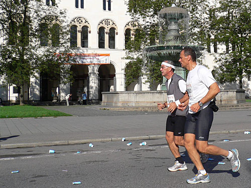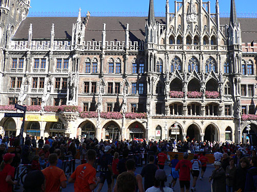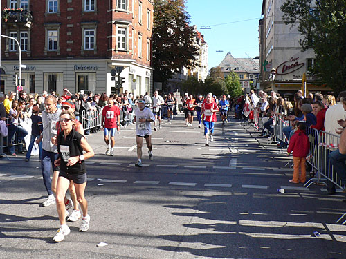 Viele Zuschauer stehen hier, der Höhepunkt wird allerdings am Marienplatz (km 13) erreicht, wo sich die Menschen dicht an die Absperrungen drängen, die Läuferinnen und Läufern lautstark anfeuern und sie abklatschen. Die Stimmung kann hier bei einer Meisterschaftsfeier der Bayern nicht besser sein.