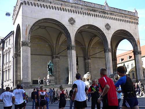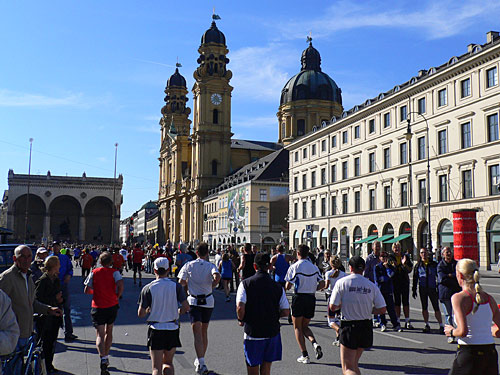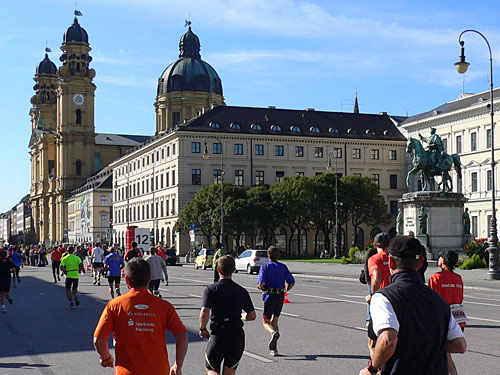 Hier haben wir eine kurze Begegnungsstrecke und können sehen, wer so ungefähr einen Kilometer hinter uns liegt. Dann kommen die Sehenswürdigkeiten Schlag auf Schlag. Zuerst der Odeonsplatz mit dem Reiterdenkmal für Ludwig I., geradeaus geht es zur Feldherrnhalle und rechts sehen wir die Theatinerkirche St. Kajetan, zu der 1663 der Grundstein gelegt und dann über 100 Jahre gebaut wurde. Links ist dann die Staatskanzlei und die Residenz mit der berühmten Patrona Bavariae. Damals war das Abkupfern offenbar groß in Mode. Die Residenz soll nämlich dem Palazzo Pitti in Florenz nachempfunden sein.