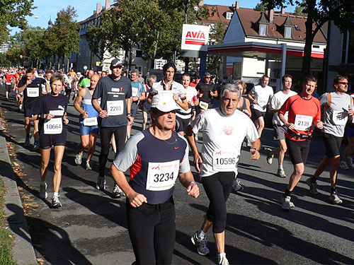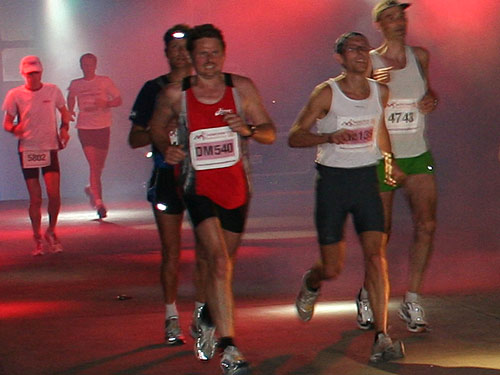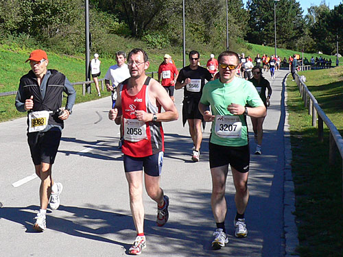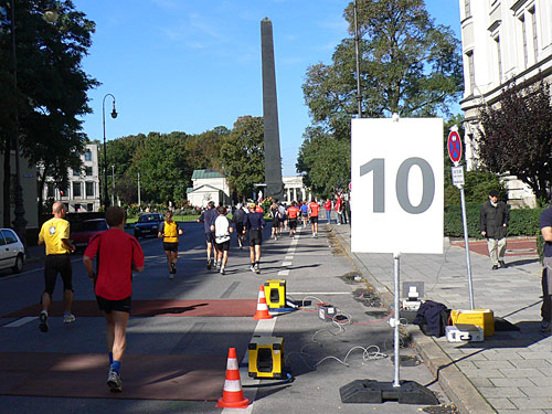 Das Wetter ist phantastisch. Keine Wolke am Himmel, knapp 10 Grad, mehr als 17 sollen es auch tagsüber nicht werden. Wer heute keine gute Zeit läuft, kann nicht auf schlechte äußere Bedingungen verweisen. Auch auf das dichte Läuferfeld kann er seine Fehlleistung nicht schieben. Denn hat man mal die Zeitmatte überschritten, geht es zügig weiter und schon nach gut einem Kilometer ist das Ganze so entzerrt, dass jeder seinen Rhythmus findet.
