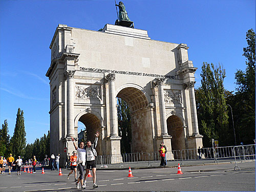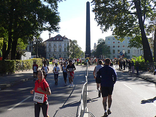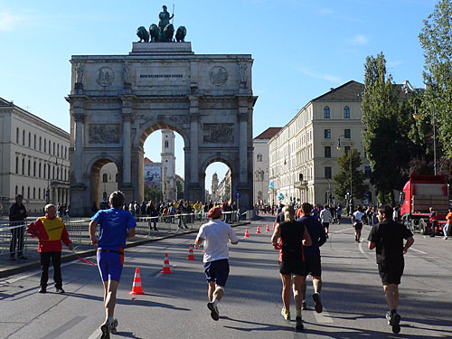Von weitem erkennen wir schon das Siegestor (km 7), das Ludwig I. nach dem Vorbild des Konstantinbogens beim Colosseum in Rom erbauen ließ. Bei Kilometer 9 erreichen wir den im Stil des europäischen Klassizismus errichteten Königsplatz, mit Propyläen und Glyptothek ein kulturelles Zentrum der Stadt. Die Ähnlichkeit mit der Akropolis ist nicht zufällig.