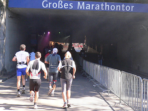 Links geht es jetzt durch eben dieses Marathontor, auch „Disco-Tunnel“ genannt, denn Nebelmaschinen, bunte Scheinwerfer und laute Musik sorgen für entsprechende Atmosphäre. Dann wird es hell, der Himmel strahlt in schönstem Blau. Ich schwebe über die Kunststoffbahn und teile mir den Applaus mit den vielen Läuferinnen und Läufern, die jetzt die letzten 200 Meter laufen.