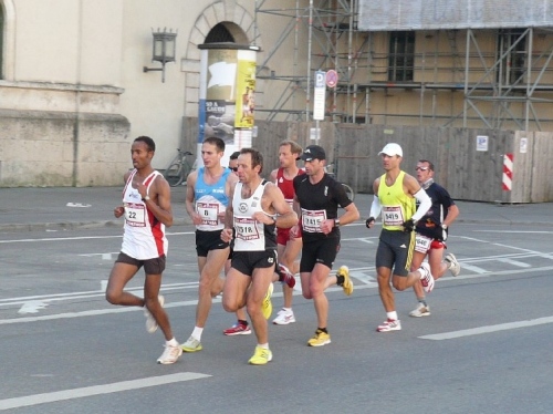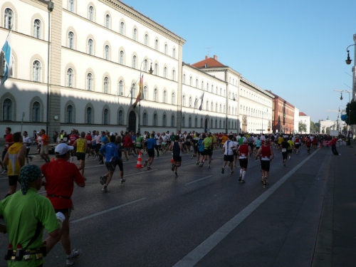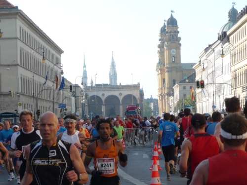 Kurz nach Kilometer vier ist die Wende auf der Ludwigstraße. Noch davor sehe ich auf der anderen Straßenseite ein führendes Duo, der Hermann Achmüller mit dabei. Die Verfolger haben schon einen gehörigen Abstand. An der Wende können wir noch einen kurzen Blick auf die Feldherrnhalle (1841 bis 1844 nach dem Vorbild der Loggia die Lanzi in Florenz erbaut) und die Theatinerkirche (Stiftskirche St. Kajetan) werfen.