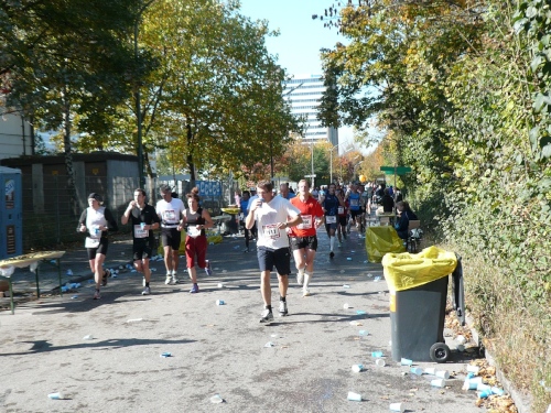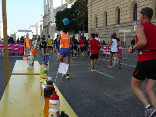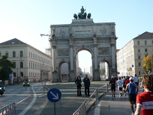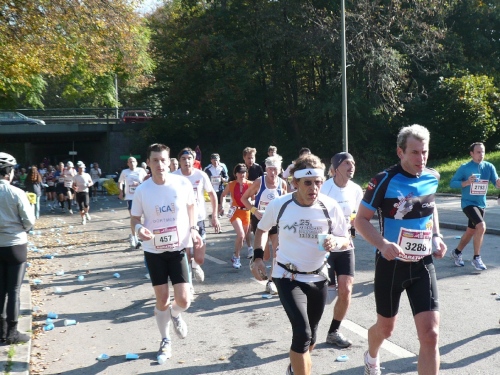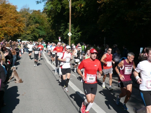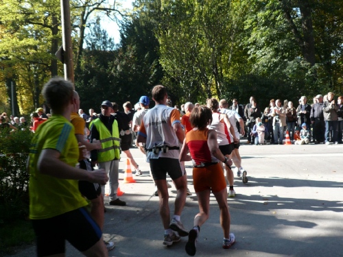 Mit dem siebten Kilometer führt dann die Strecke in den Englischen Garten. Der ist ein Werk eines Amerikaners: Benjamin Thompson hat ihn zu Beginn des 19. Jahrhunderts erschaffen. Leider haben wir hier nur wenig Zuschauer. Außer Wald gibt’s hier nichts zu sehen, nicht mal ein Nackerter lässt sich blicken. Dafür ist’s ja deutlich zu kalt. Immerhin unterhält uns eine Kapelle. Die Münchener Bläserbuben bringen uns musikalisch in Schwung. Ein Stückchen weiter steht das Puchheimer Blasorchester. Lobenswert, wie oft wir musikalisch unterhalten werden.