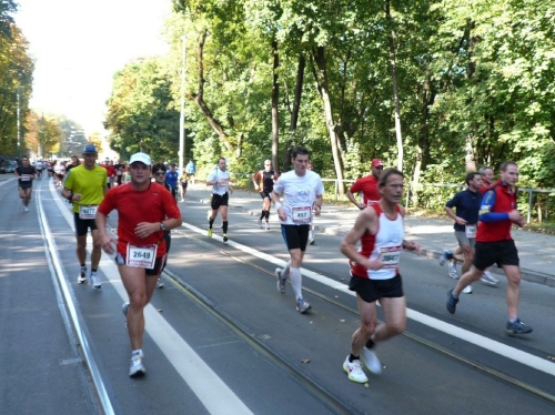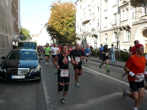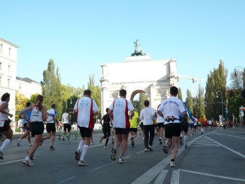 Wir laufen nun über die Max-Joseph-Brücke und überqueren dabei den Isarfluss. Rund 15 Höhenmeter sind jetzt auf der Montgelasstraße zu überwinden. Das Feld macht langsam. Ist gar nicht so verkehrt. Ab dem Herkomerplatz geht es wieder leichter, denn die Steigung endet.
