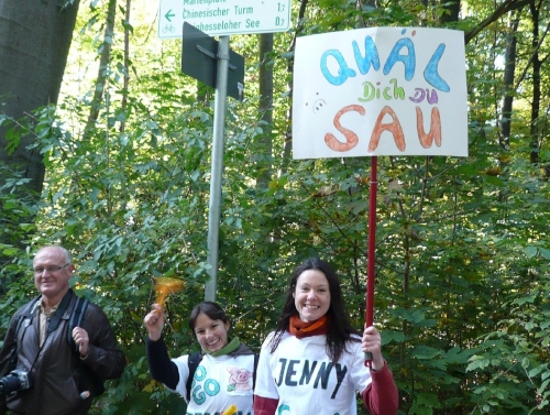 Ein paar Meter weiter finde ich wieder meinen Lieblingsspruch: „Quäl Dich Du Sau.“ Ich weiß zwar nicht, wem er gilt, aber ein paar Lacher löse ich aus, als ich die beiden Mädels fotografiere. Das Laub ist dieses Jahr in den schönsten Herbstfarben getönt. Der nächste ausgiebige Regen und Wind wird dann das noch hängende Laub von den Ästen und Zweigen fegen.