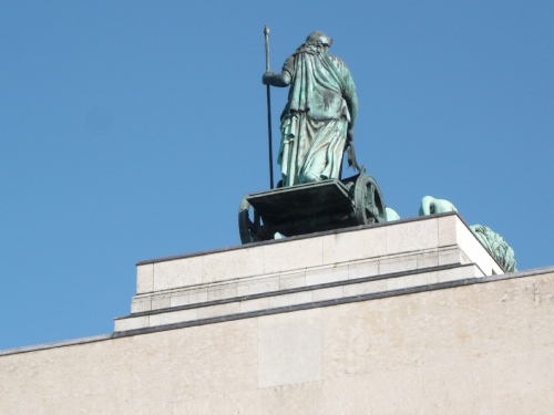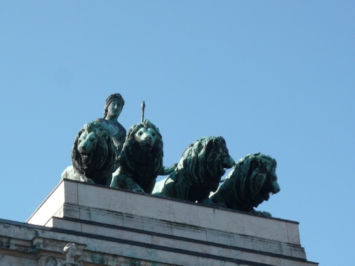 Im Süden, fast im Gegenlicht, ist das Siegestor zu erkennen. 1840 erteilte Ludwig I den Auftrag zu diesem Triumphbogen, der dem Konstantinsbogen in Rom ähnelt. Von oben herab grüßt die Quadriga (Bavaria mit vier Löwen). Nach den Zerstörungen im Zweiten Weltkrieg wurde das Bauwerk vereinfacht wiederhergestellt. Mit der Inschrift „Dem Sieg geweiht, vom Krieg zerstört, zum Frieden mahnend“ ist es von einem Kriegsdenkmal zu einem Mahnmal zum Frieden geworden.