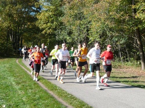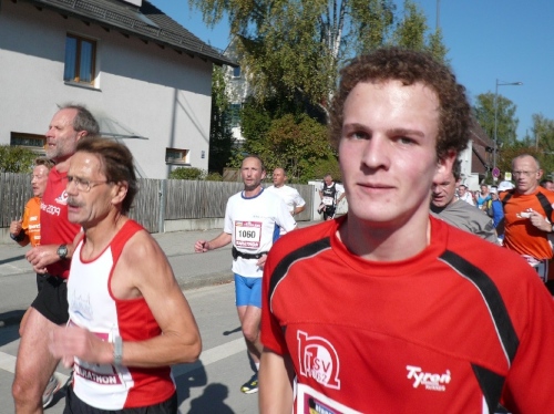 Ich bin noch nicht beim ersten Kilometer angekommen, da kommt schon der Stefan von hinten heran gelaufen. Grad ist noch Zeit für einen Schnappschuss, dann zieht er davon. Er möchte seine Bestzeit verbessern.