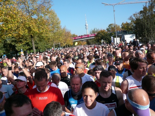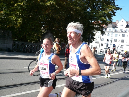 Von meinen bestellten Vereinsfreunden findet nur der Stefan Heckl den Weg zum gemeinsamen Bild an die Startlinie. Als Fotograf verpflichten wir einen 63jährigen Japaner. Im Startfeld sehe ich einen weiteren Bekannten. Fritz Edelmann hat als einer von Fünfen bisher alle 24 Münchener Marathonläufe erfolgreich bewältigt.