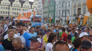 Zwei Runden à 3 km stehen zuerst auf dem Programm: Über die Lange Straße dann auf die Fußgängerzone in der Altstadt. Vor uns bei km 1 das Kröpeliner Tor, das westlichste der vier großen Stadttore. Lin...