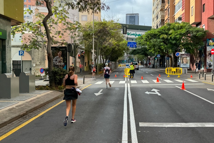 Von der vierspurigen Straße sind die rechten zwei Spuren für die Läufer gesperrt. Die linken zwei Spuren sind für den Autoverkehr. Der ist aber sehr übersichtlich. Da reichen zwei Spuren völlig aus. Die Straße verläuft ins zehn Kilometer entfernte San Andrés mit dem schönen Las Teresitas -Strand. Zwei Abzweigungen führen ins Anaga-Gebirge. Dieses bildet den nordöstlichen Zipfel Teneriffas. Der Gebirgszug ist der älteste Teil der Insel und auf der Südseite recht karg, auf der Nordseite mit Eukalyptuswald bewachsen. Dort gibt es mindestens einen Trail-Marathon. Aber aufgepasst: Die Cut-Off Zeiten können leider nur von erfahrenen Trailläufern geschafft werden. Schade für mich.